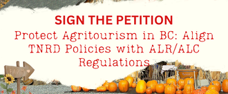 Protect Agritourism in BC: Align TNRD Policies with ALR/ALC RegulationsOur Call to Action We, the undersigned, call on the Thompson‑Nicola Regional District to: 1. Align local bylaws with ALR/ALC agritourism policies to ensure consistency and fairness. 2. Stop misclassifying temporary agritourism accommodations as residential dwellings. 3. Collaborate with industry groups, chambers, and tourism organizations to create a clear, fair agritourism toolkit that supports both farmers and regulators.16 of 100 SignaturesCreated by Kaare Long